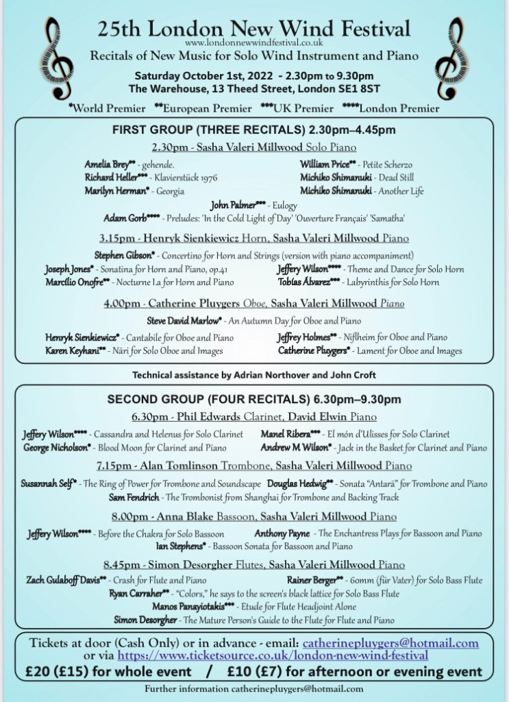 “Etude for Flute Headjoint Alone”, selected and performed by the amazing flutist Simon Desorgher at the 25th London New Winds Festival, on 1 October at the Waterloo Warehouse.
